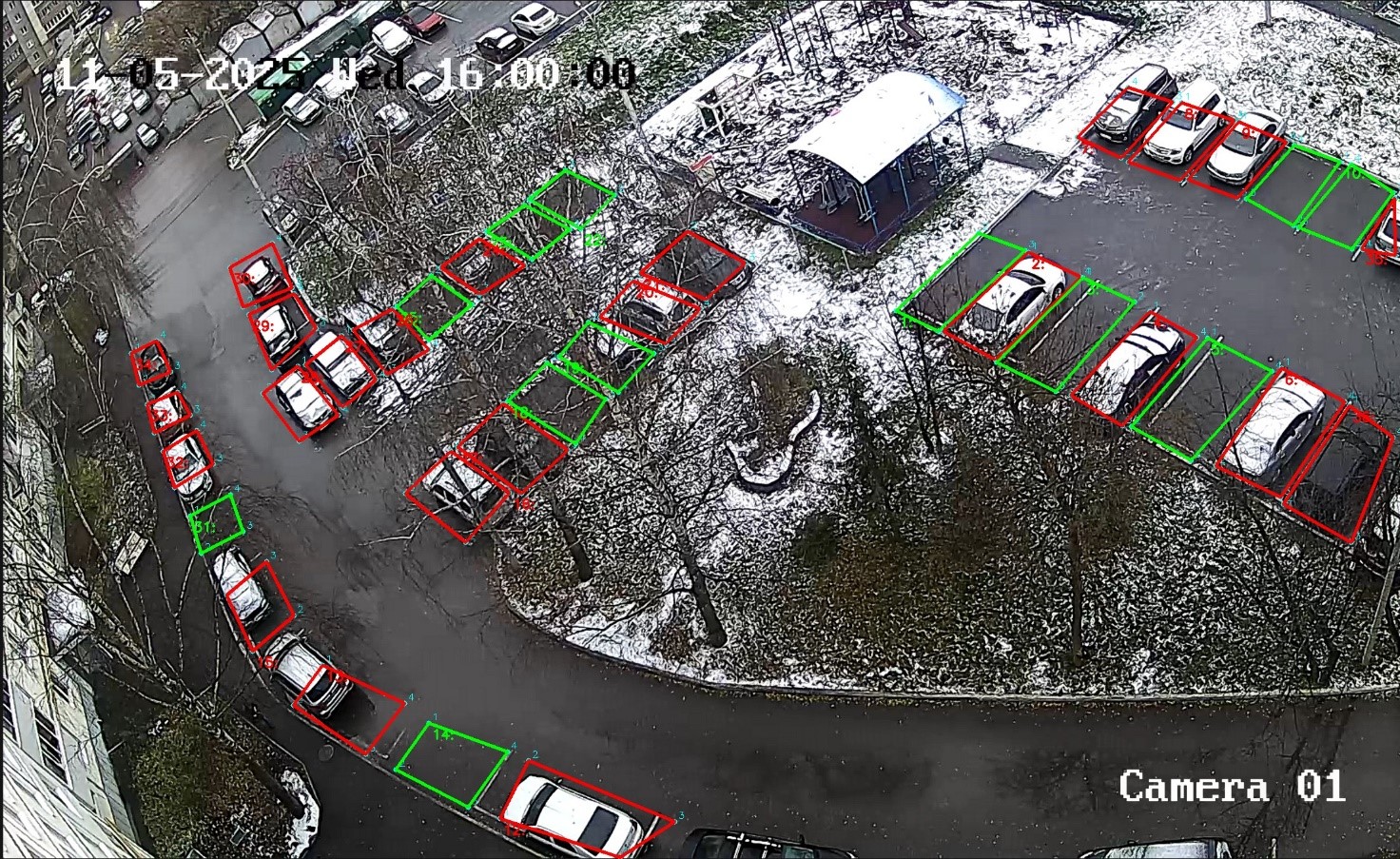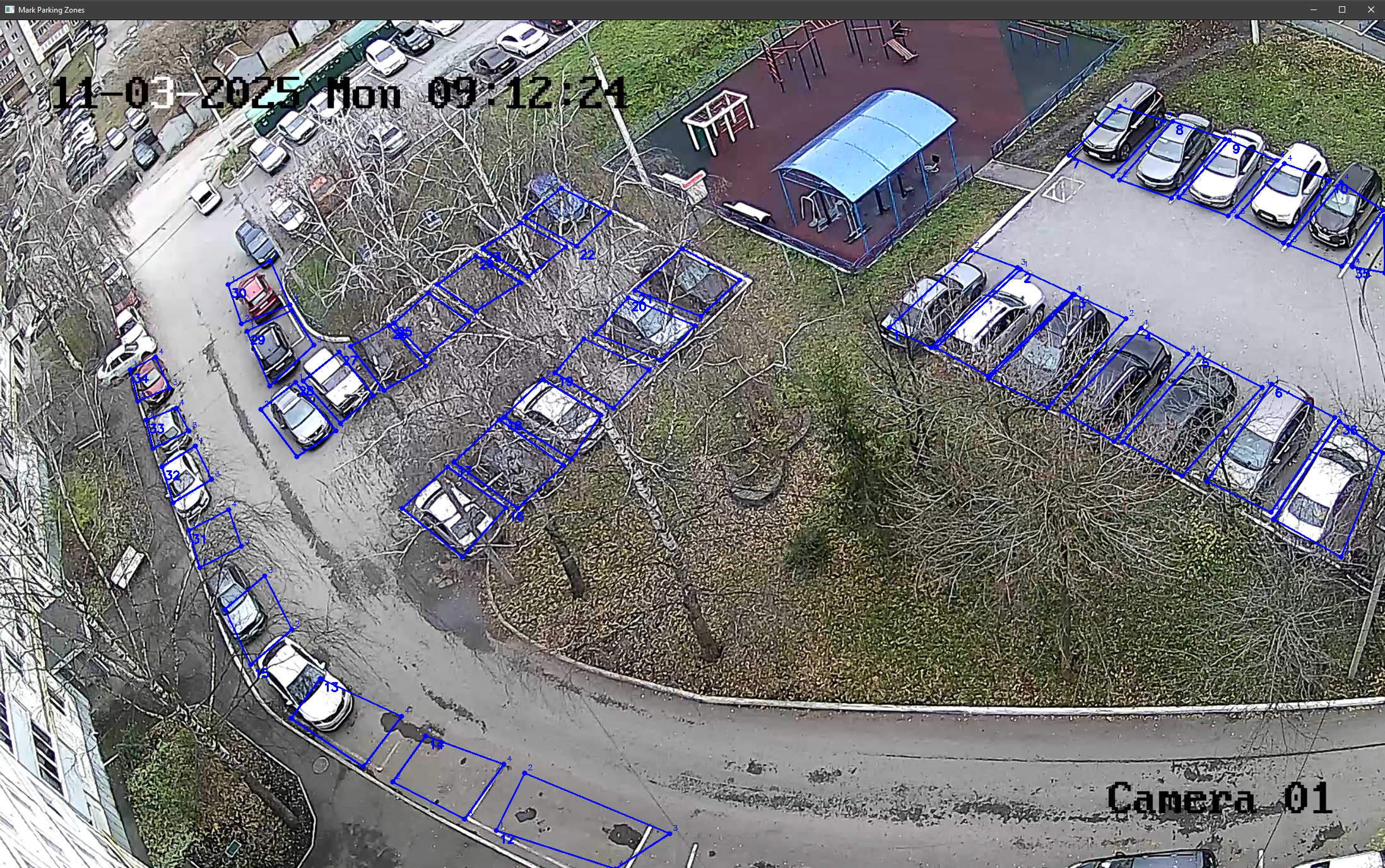 Ключевой особенностью системы является не только детекция автомобилей, но и точное определение границ каждого парковочного места. Для этого была специально разработана вспомогательная desktop-программа с графическим интерфейсом. Эта программа позволяет оператору с высокой точностью вручную разметить парковочные зоны, очерчивая их полигонами с помощью четырёх точек. Для определения того, занято ли конкретное место, система использует метрику IoU (Intersection over Union), вычисляя степень пересечения bounding box’а обнаруженного автомобиля и контура парковочного места.