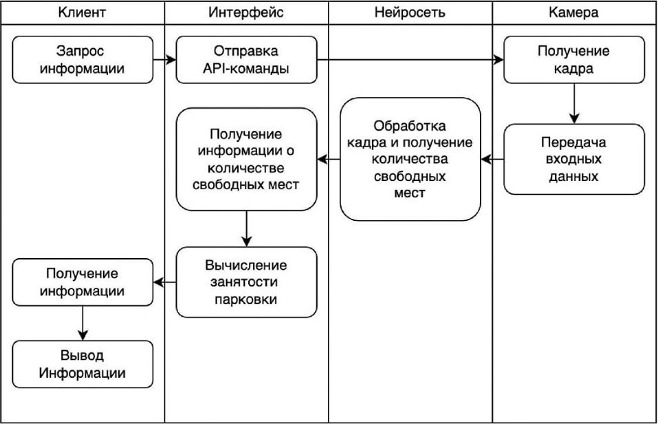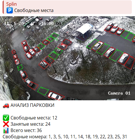 Для взаимодействия с пользователем был создан удобный Telegram-бот «Parky». При обращении пользователя бот отправляет запрос на сервер, который инициирует процесс анализа: получает текущий кадр с камеры, обрабатывает его с помощью обученной нейросетевой модели и определяет наличие транспортных средств в заранее размеченных зонах. Результат в виде обработанного изображения, где свободные места отмечены зеленым цветом, а занятые — красным, незамедлительно отправляется обратно пользователю.